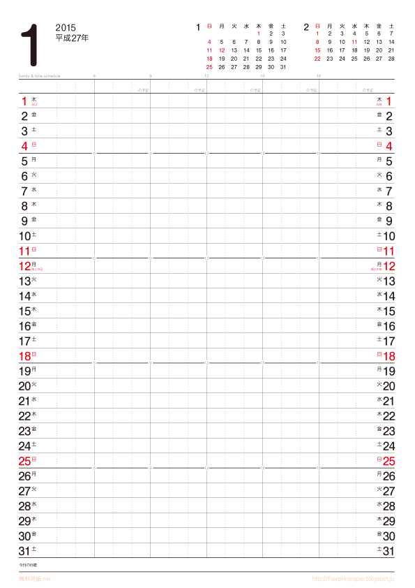 無料用紙net 無料用紙 15シンプルカレンダー ファミリータイプ バーチカルタイプ タテ ダウンロード